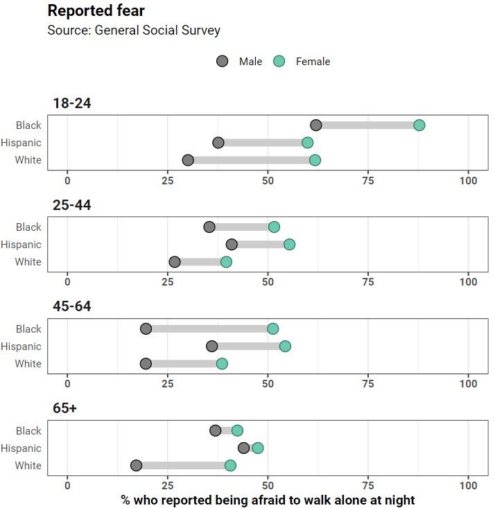 Afraid to walk alone at night | Percent of people who indicated they would be afraid to walk alone at night within a mile of their location. | FEAR = 1 |